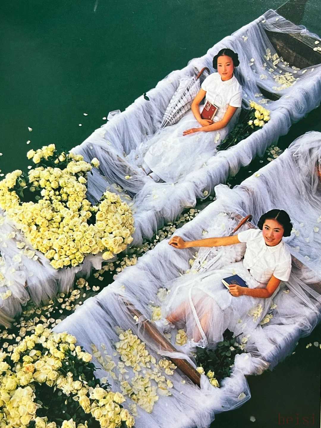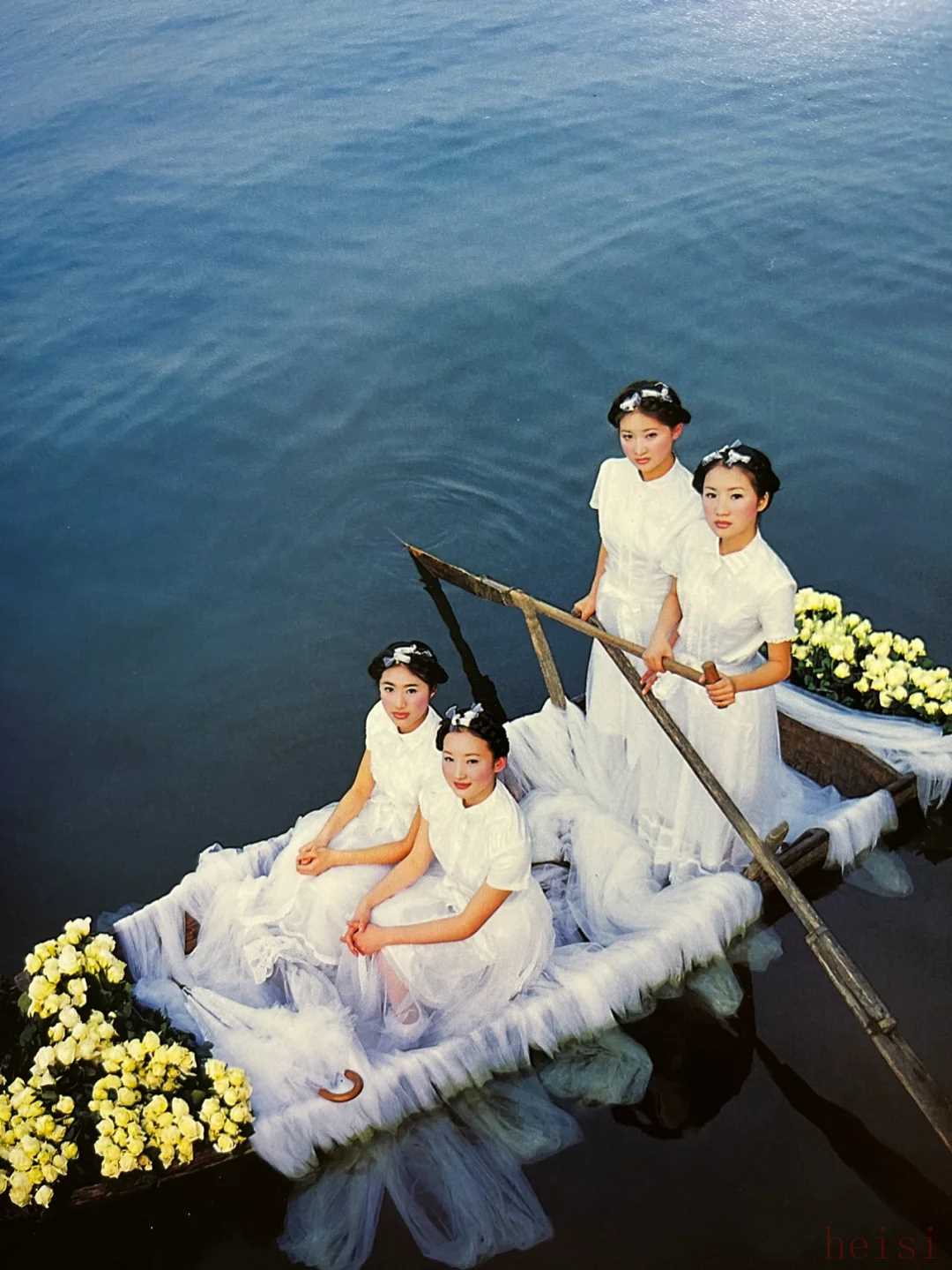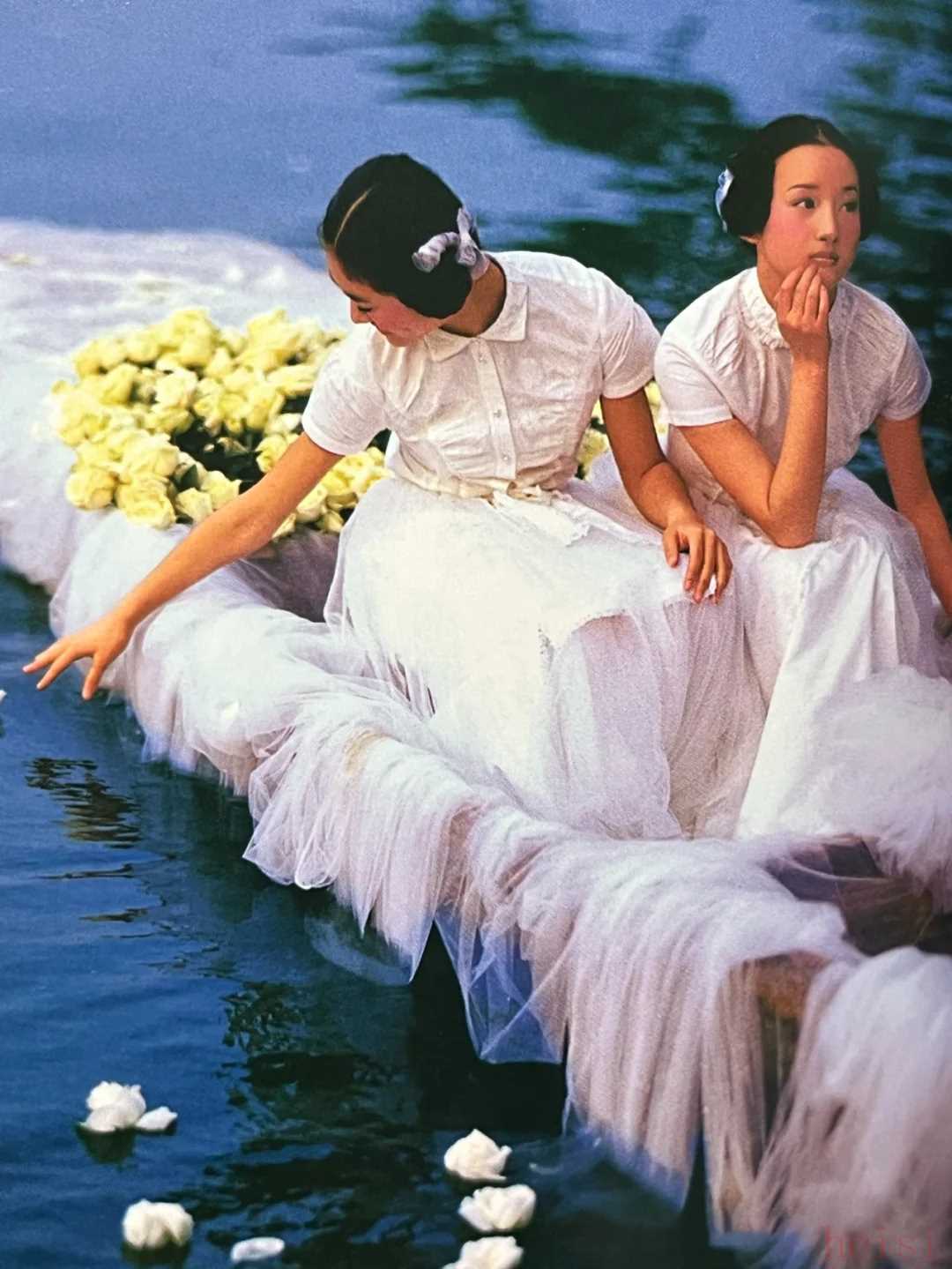 比如2000年的“天鹅湖”系列,她们在一片湖泊上取景,浪漫的元素铺满了整个船身,一群穿白裙的少女划着船戏水,纯净如油画一般。