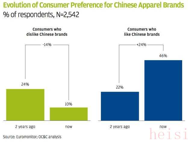 不过,该报告同时显示,中国消费者对本土品牌的好感度从两年前的22%上升到了46%。原因是新一代中国本土服装品牌的兴起,这让中国消费者对本土品牌的喜好程度有所改善。
