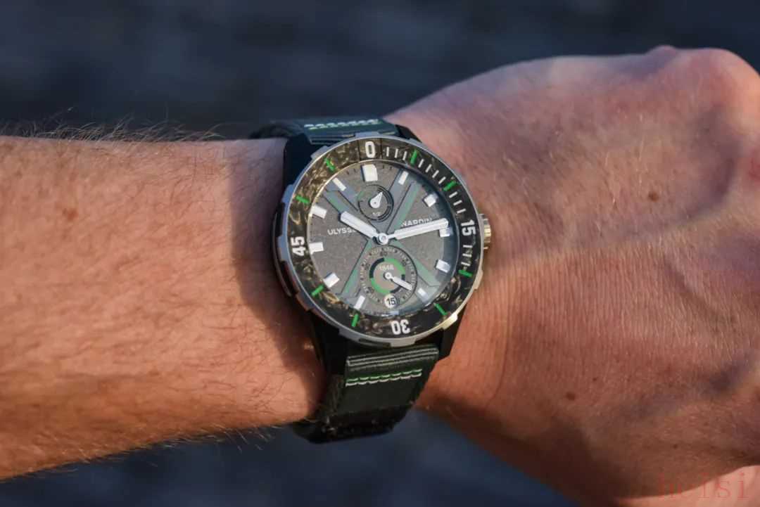 这只腕表用亮眼的绿色点缀了多处设计细节,也是有呼吁大家保护自然的用意,与黑白灰的主题形成对比,也是绿表中非常独特的一款了~