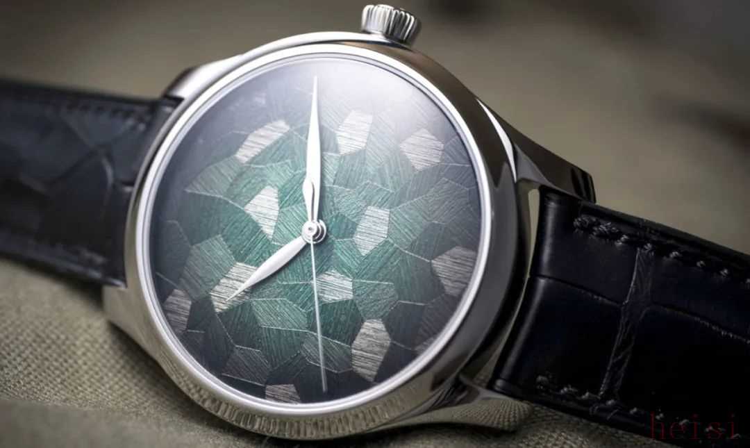 亨利慕时还有一块马赛克绿,设计也是非常罕见。表盘呈现一种碎片拼接而成的马赛克效果,在每个单独的蚀刻元素上都加入了拉丝图案,非常值得细品。
