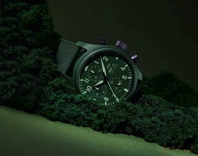万国表今年更会玩儿,联合色彩机构潘通推出一款TOP GUN系列森林绿腕表,源自草木和陆军制服色彩,深邃耐看。