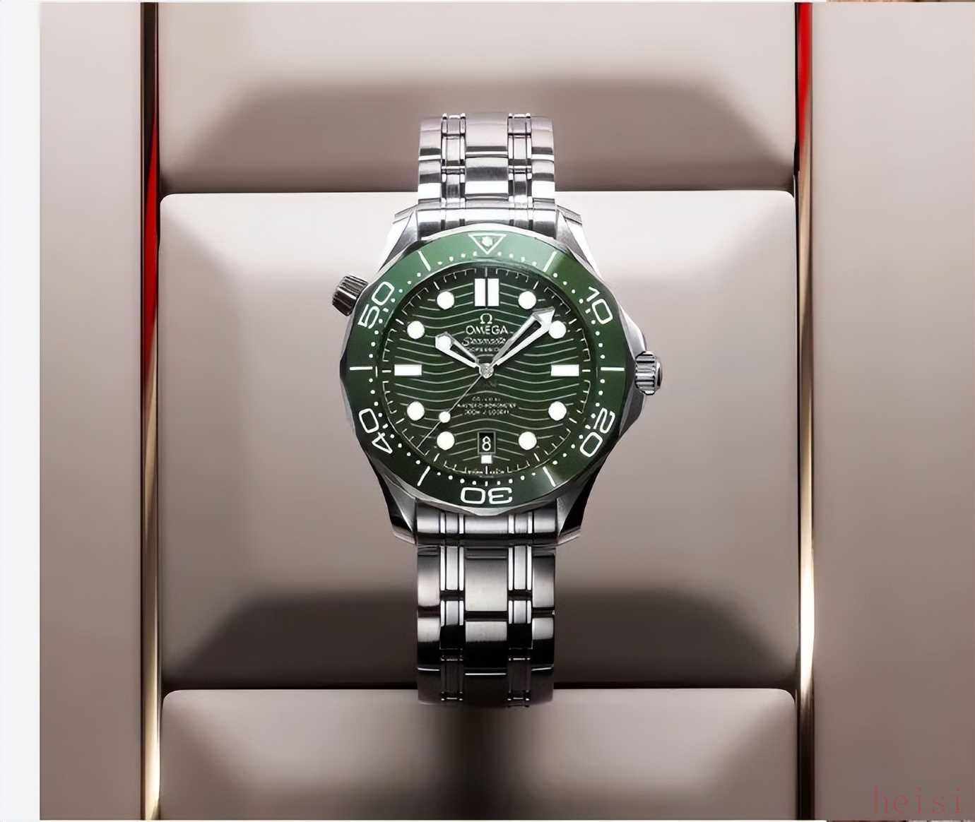 欧米茄今年也推出了好几只绿表。比如新推出的一块“绿海马”——海马系列300米潜水表,就讨论度非常高,用深绿波纹表盘呈现表盘,搭配抛光绿色陶瓷表圈, 感觉早已爆款预定,还有不少表迷玩梗买绿马得绿码~