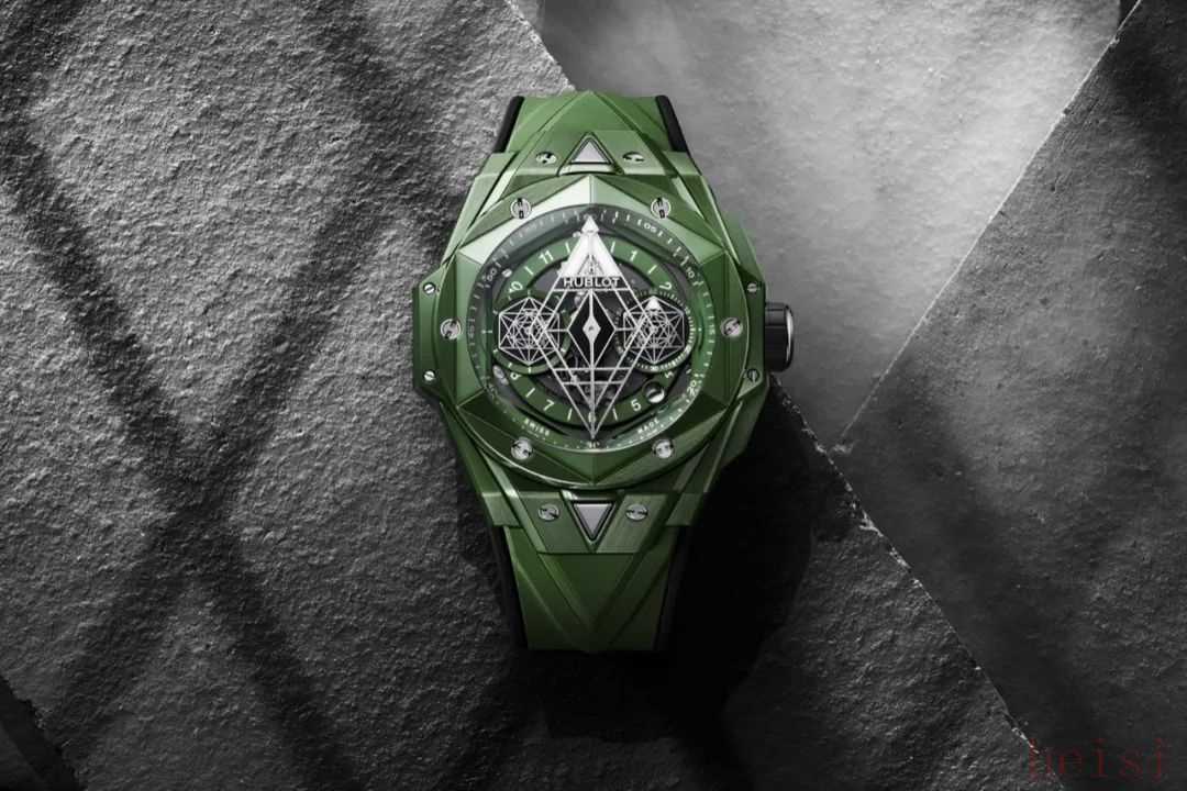 表壳采用绿色陶瓷材质制作,表面运用立体几何图形,呈现出精妙的浮雕效果和深邃质感,每一个角度都呈现出一种雕塑美感。限量发售200枚~