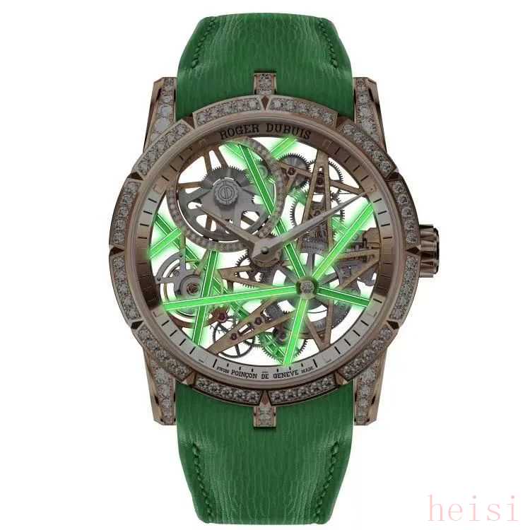 罗杰杜彼最近推出一枚Excalibur Blacklight镂空自动表,盘内的霓虹绿色镂空板桥设计别具一格,镶嵌134颗钻石,就算是在夜晚也无比闪耀。