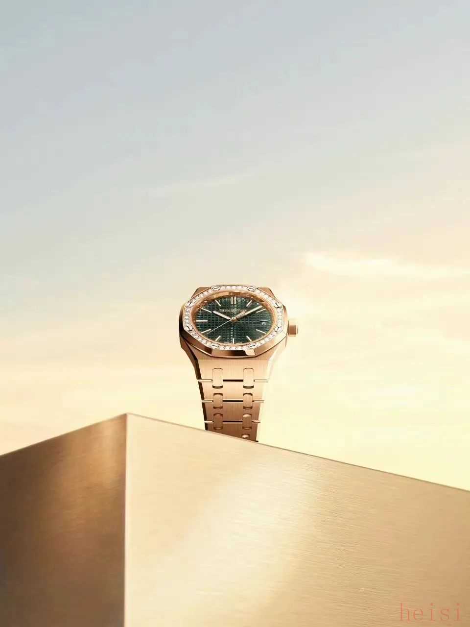 这只绿盘皇家橡树系列自动上链腕表“50周年纪念款”也是最近很火的款式,18K玫瑰金表壳,表圈镶嵌明亮形切割美钻,军绿色表盘镌刻“Grande Tapisserie”大格纹装饰,把精致运动风演绎到极致~