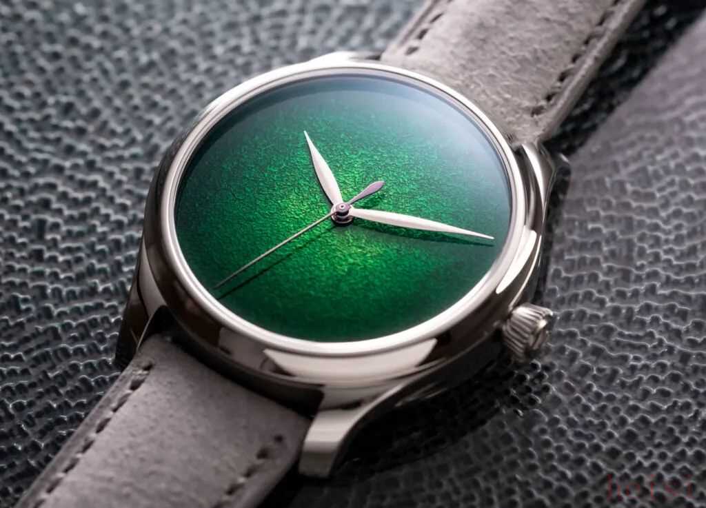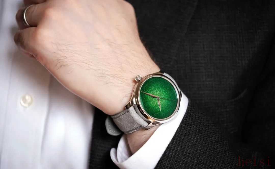 亨利慕时这枚Endeavour Center Seconds Concept Lime Green腕表,表盘经过锤打呈现出细腻而粗犷的矿物质效果,然后用大明火珐琅进行平滑处理,表盘从绿色渐变到边缘黑色,深邃耐看,有种翡翠的既视感。