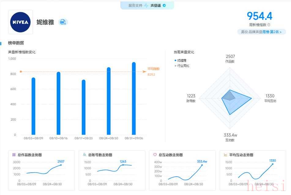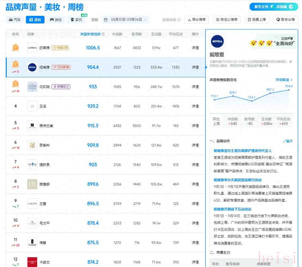 新榜品牌声量・美妆周榜(08 月 31 - 09 月 06 日)发布,妮维雅以 954.4 的声量新榜指数跃居第二 ,环比上周排名提升11名,作品数增加 540,互动量提升 208w ,在竞争激烈的美妆市场中成功突围,热度持续高涨。