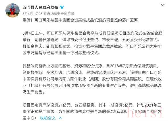 而在今年8月,“五河县人民政府发布”微博账号曾发布消息称,可口可乐与蒙牛集团合资高端成品低温奶项目签约仪式在省城合肥举行。