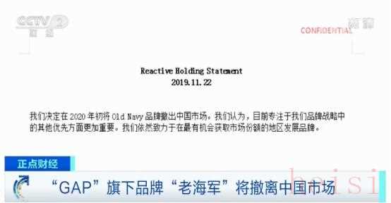 记者观察到,早在今年9月,老海军位于上海静安寺的旗舰店就已停业,但目前茅台路的门店并没有张贴要关店的通知。随后记者来到南京西路GAP公司办公室,工作人员对记者表示,虽然没有对外发布公告,但集团总部确实已经决定在2020年初将旗下品牌OldNavy全部撤出中国,随后工作人员向记者发送了正式通告的邮件。
