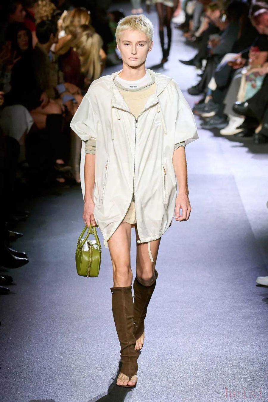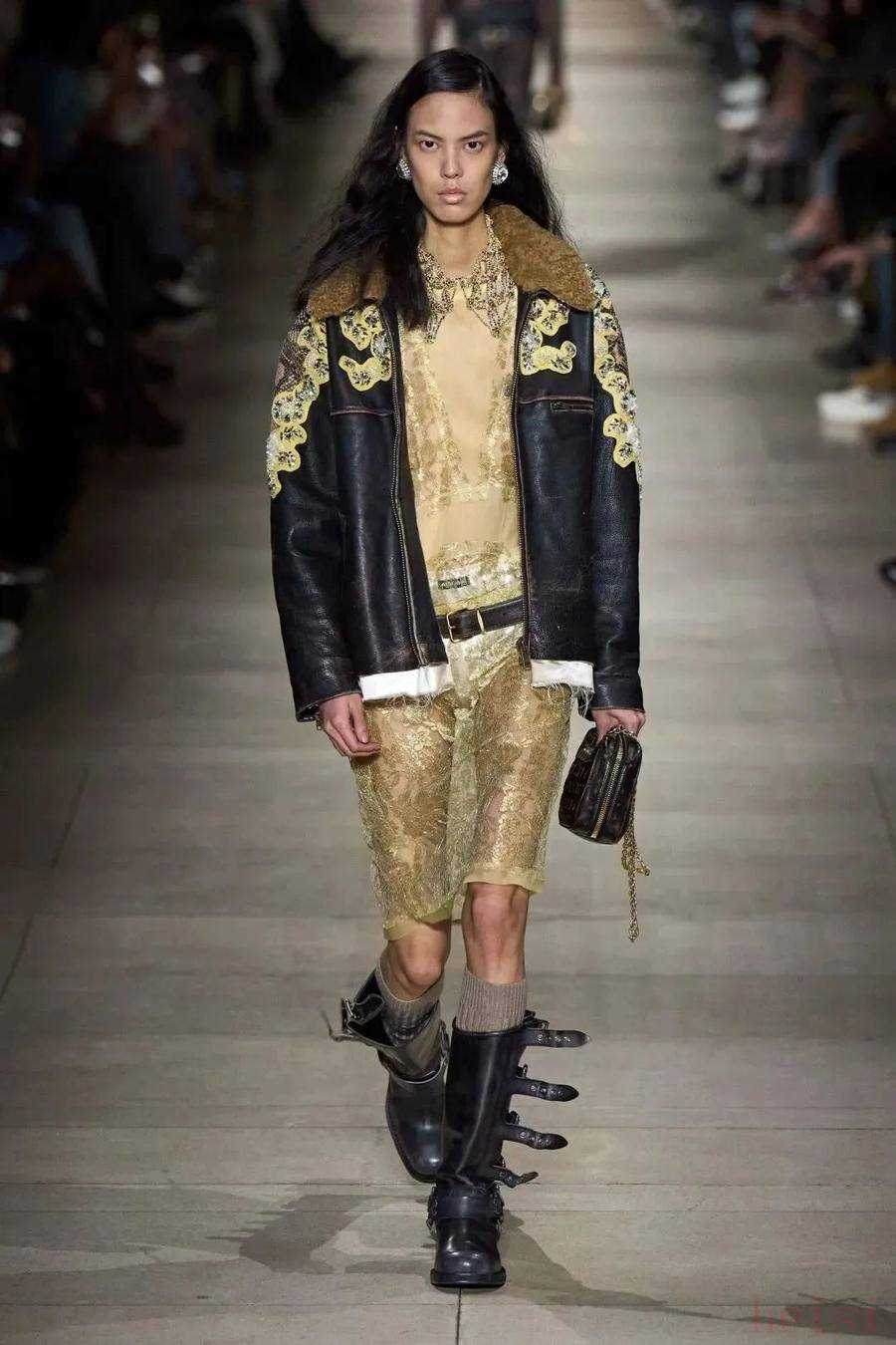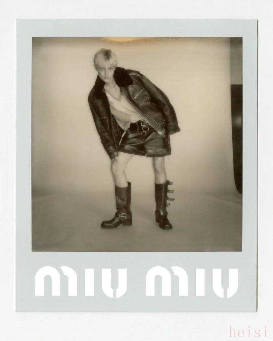 更符合Miuccia个人风格的Miu Miu则构建了一个她认为眼中年轻、特立独行的年轻时髦女孩模样。不带有任何讨好性的美,“坏品味”低腰混搭优雅百褶裙,穿夹克的女孩野蛮而美丽。