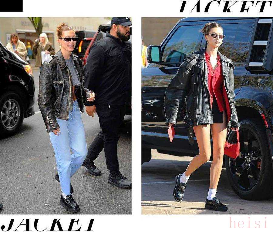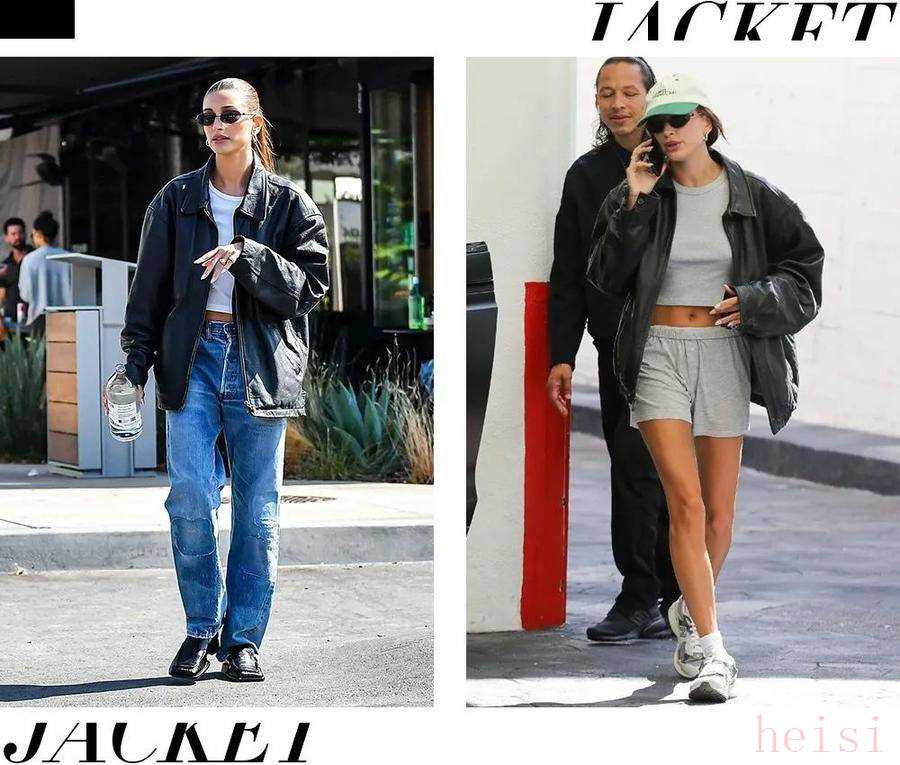 这股夹克的流行时尚ICON们也功不可没,Hailey Bieber的皮夹克街拍成为了无数女孩的模仿对象。重点单品的分量感让夹克可以成为一套穿搭的中心要素。