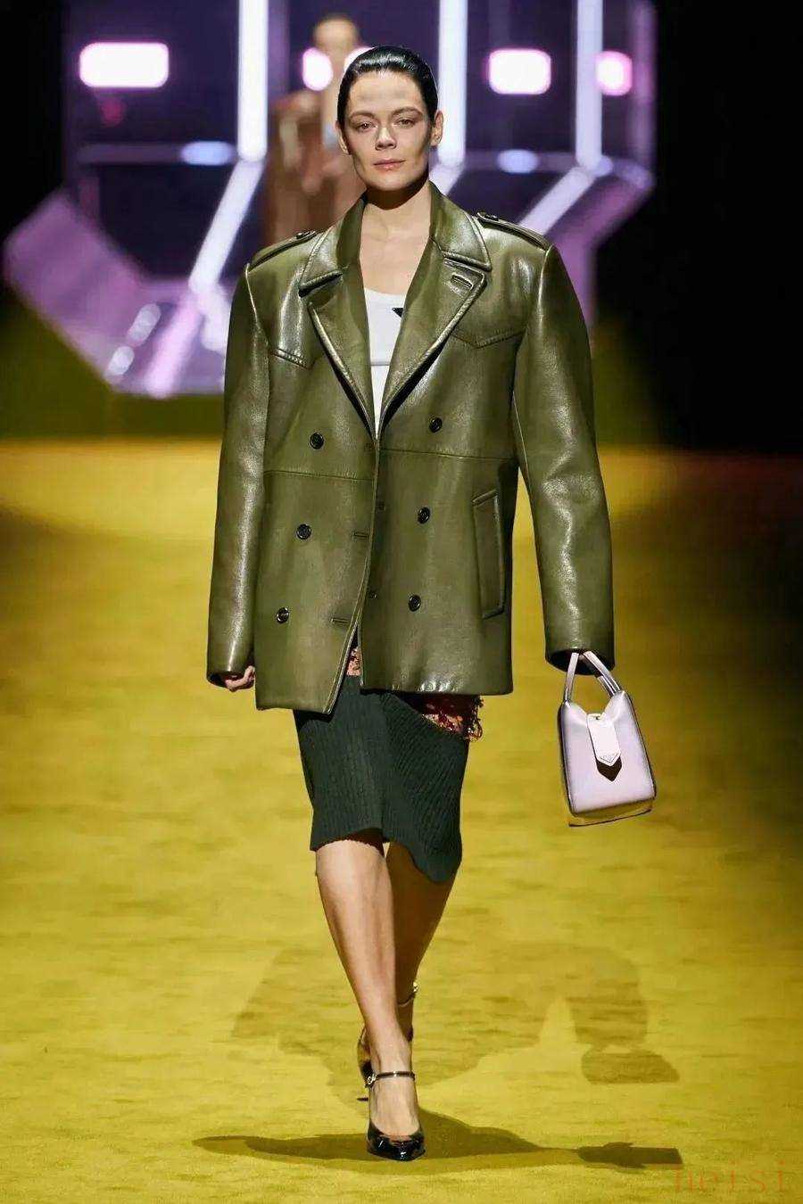 Miuccia Prada用Prada和Miu Miu两个品牌进行了一场关于夹克的流行实验。从2022春夏系列开始,Miuccia用三场秀奠定了夹克在未来2年的流行趋势——做旧效果、老干部夹克、廓形皮衣,夹克正在与时髦一词画上等号。