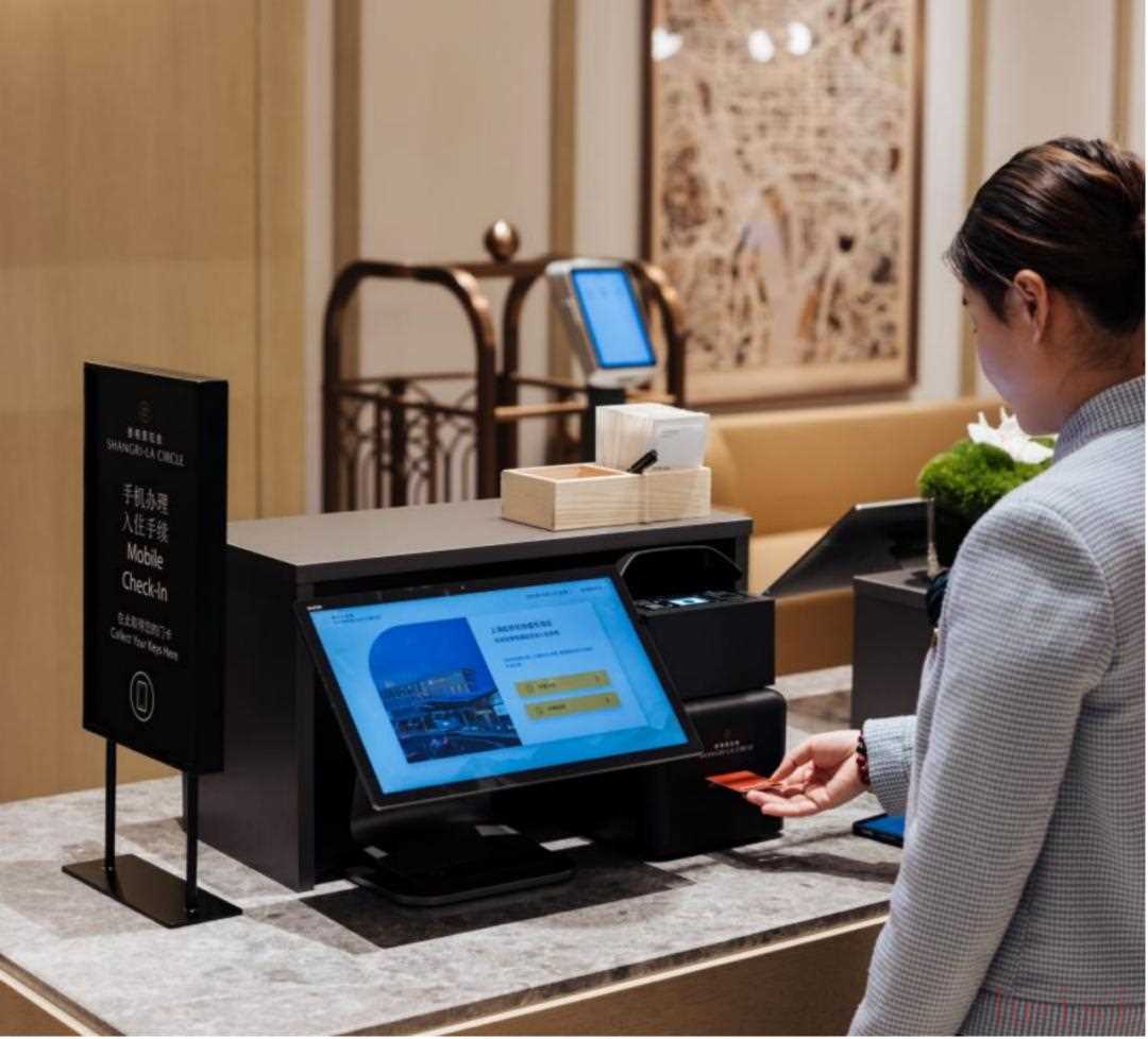 上海虹桥机场香格里拉(图正中)及盛贸(图左侧)酒店大堂这也是“盛贸(Traders)”品牌的焕新亮相。这个品牌其实早在1989年就已推出,但未作为主力产品线并一度暂停。这次重启,也是香格里拉集团面向新一代商旅客群的一次品牌创新。尤其值得关注的一点:在面向商旅客户、竞争激烈的酒店市场中,作为向来稳扎稳打的行业引领者,香格里拉给出的解法是什么?盛贸酒店“不一样”之处何在?36氪探访了上海虹桥机场内的盛贸酒店,第一感受是,“科技感”很强。入住第一步,就是集团自主研发的自助check-in/check-out系统,其出入境证件兼容性处于行业前沿,可支持居民身份证和全球护照。类似于线上值机,如果你到店前已通过香格里拉APP完成线上check-in,只需在前台进行身份核验即可一键入住,最快只要15秒。