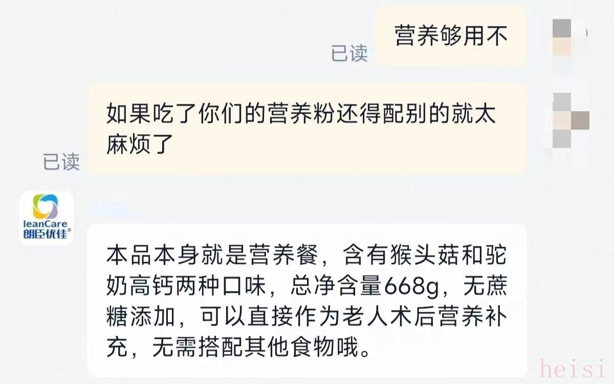 朗臣优佳旗舰店客服则称,其这款中老年营养粉容易消化,适合术后流食需求,儿童、成人、中年人、老年人、代餐人群、吞咽困难、吃流食、鼻饲及打胃管的人都可以放心食用。当问及产品营养是否充足,客服答复称,“本品本身就是营养餐,含有猴头菇和驼奶高钙两种口味,总净含量688g,无蔗糖添加,可以直接作为老人术后营养补充,无需搭配其他食物”。