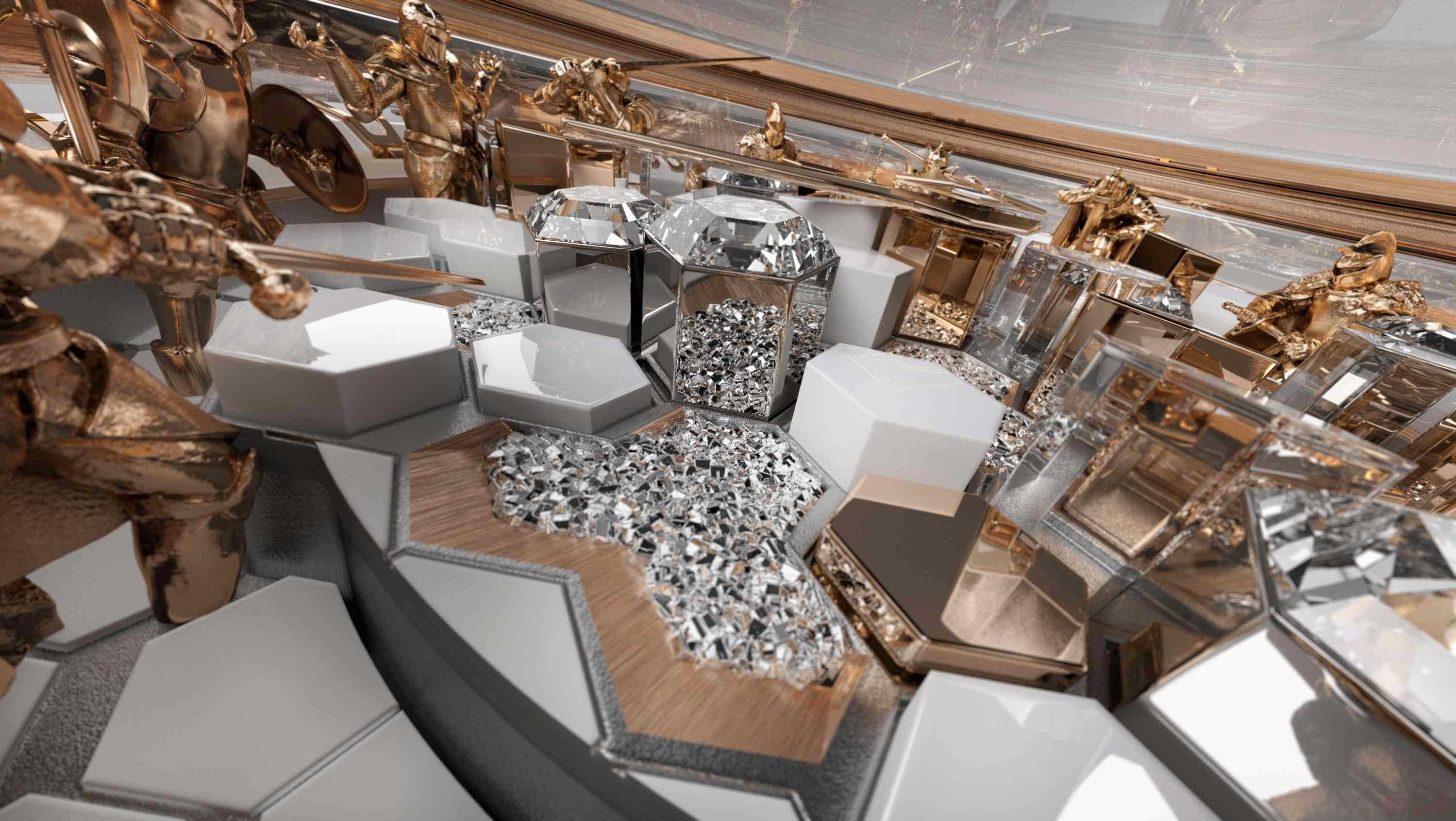 表盘底部以18K玫瑰金打造,通过精密雕凿呈现出孔洞与六边形排列的底部。制表师将56根高度不一的柱体嵌入表盘,这些柱体呈0.2毫米到3.7毫米不等,包括9根穆拉诺风格玻璃柱、19根抛光白色珐琅柱、10根亚光白色珐琅柱、9根镀铑黄金柱,以及9根抛光18K玫瑰金柱。多种材质错落交织,在方寸表盘上构筑充满张力与视觉对比的宫殿景象。
