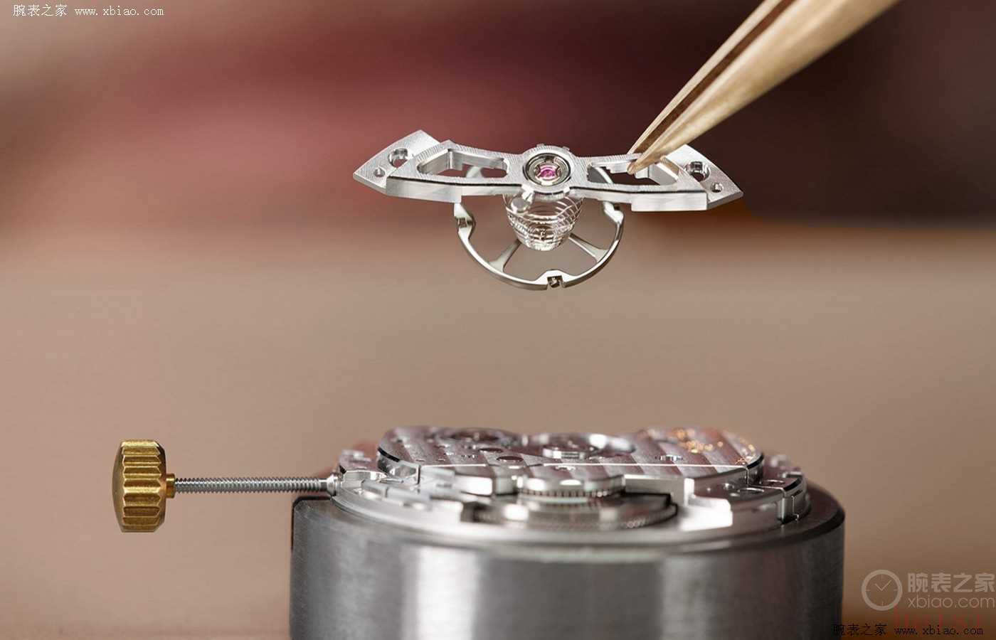 GP4800型机芯的主夹板采用喷砂和珍珠圆纹打磨,桥板饰以日内瓦波纹,细节丰富。材质方面,擒纵机构(擒纵轮、擒纵叉)和滚轴均采用硅制成,拥有轻盈、抗磁耐磨的特性,且具备一定的抗磁能力。以3N黄金制成的单向上弦镂空摆陀,镌刻箭形图案——源自品牌标志性的“三金桥陀飞轮”造型。