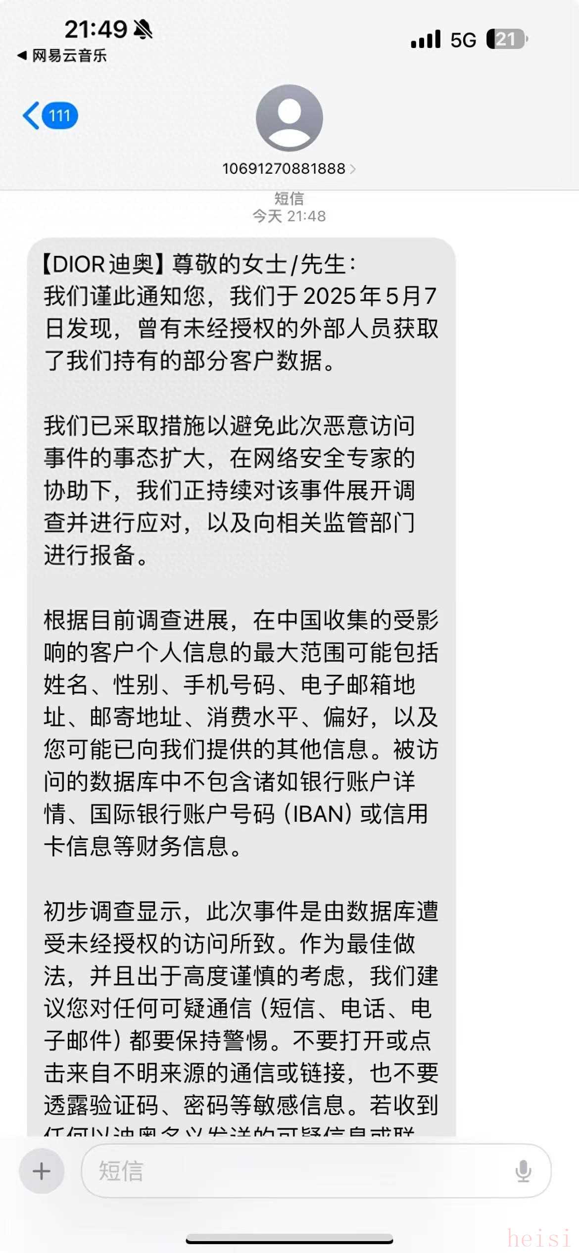 短信称,Dior于5月7日发现,曾有未经授权的外部人员获取了部分客户数据,“我们已采取措施已避免此次恶意访问事件的事态扩大,我们正持续对该事件展开调查并进行应对,以及向相关监管部门进行报备。”