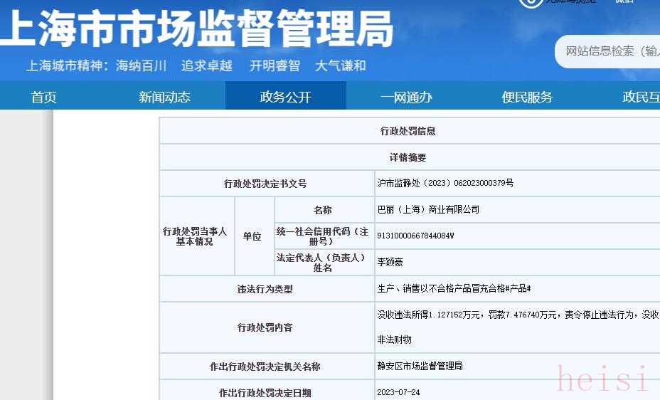 中国网财经8月8日讯(记者 叶加)日前,瑞士奢侈品品牌BALLY中国关联公司巴丽(上海)商业有限公司,因销售不合格男式双肩包,被静安区市场监督管理局罚款7.4万余元、没收违法所得1.1万余元,处罚日期为2023年7月24日。