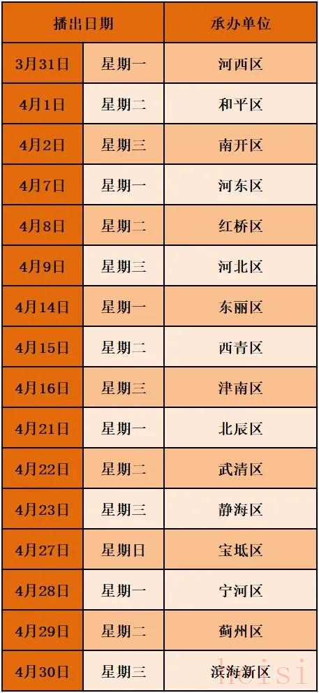 播出时间3月31日-4月30日8:00-9:00直播平台广播直播平台▼天津新闻广播(FM97.2 AM909)网络视频直播平台▼津云客户端、“津云”抖音号、“天津广播”微信视频号、抖音号中国网、国际在线、央广网等中央重点新闻网站平台腾讯、网易、搜狐、知乎、抖音等主要商业网站平台征集热线022-23601111节目安排