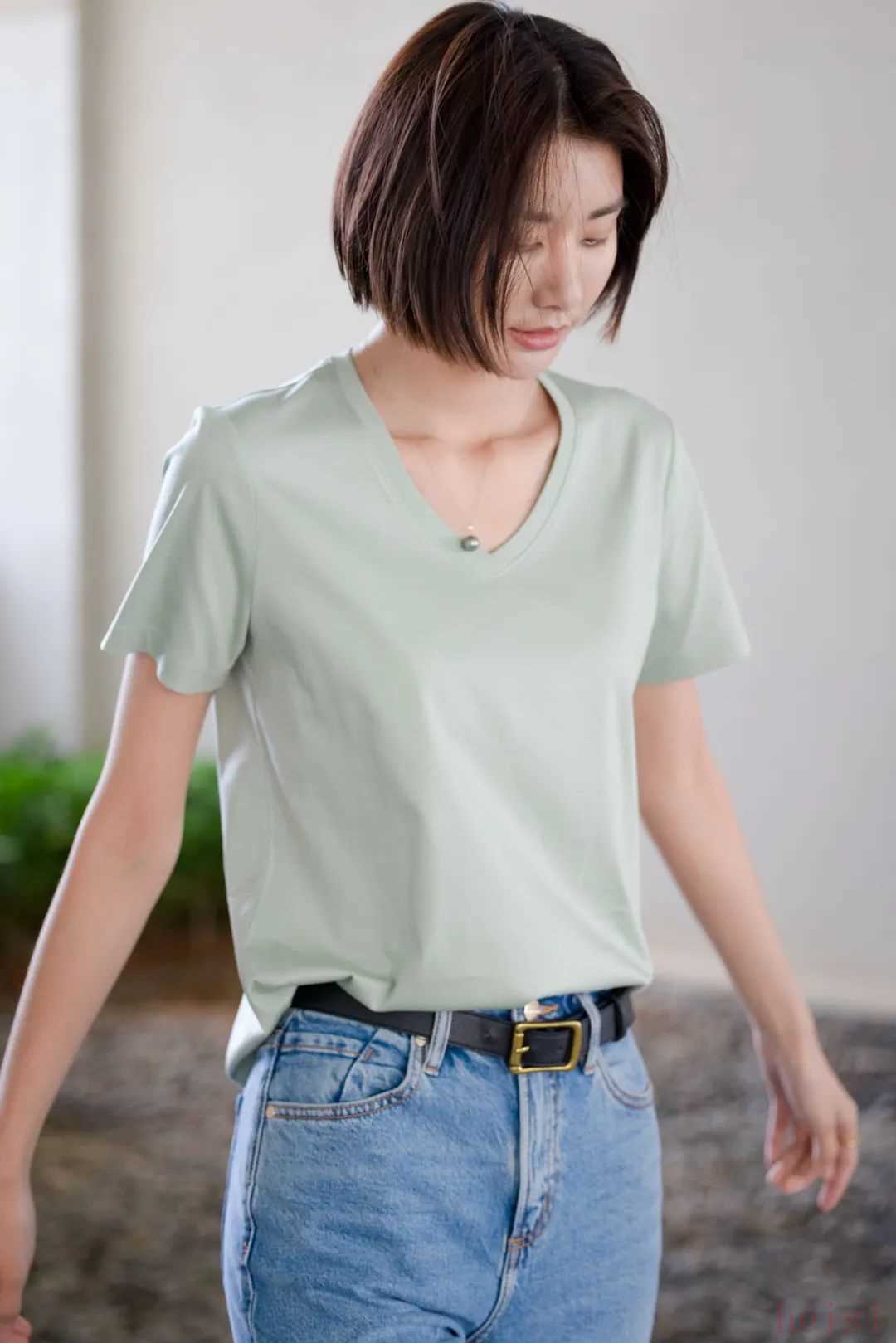除了长绒棉,还加入了一些人造纤维(莫代尔)和桑蚕丝。有了莫代尔的加持,它的抗皱力和悬垂性都更优越。对于要常丢进洗衣机的T恤来说,它还能让面料更持久耐穿。
