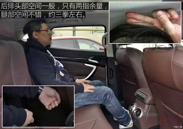 来到后排之后,腿部空间三拳,表现不错,而头部空间仅有两指,这就有点儿说不过去了,应该是受到车顶溜背造型的影响,导致头部空间表现一般。不过座椅的柔软度和对腿部的承托性都不错。