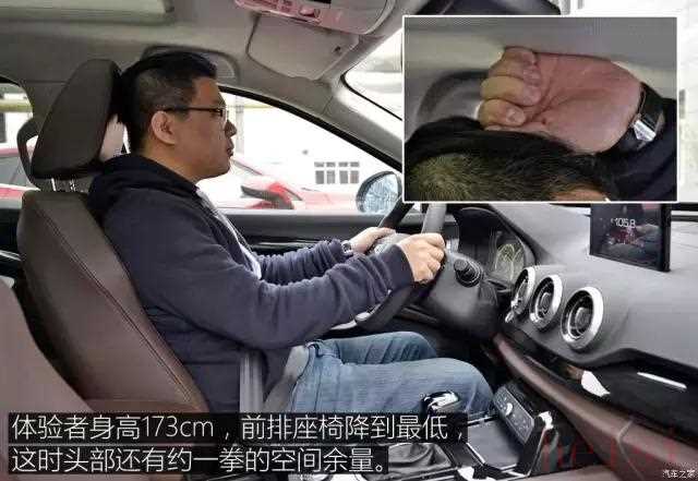 空间方面,身高173mm的体验者前排座椅降到最低,调整到合适坐姿,头部空间一拳,表现正常。