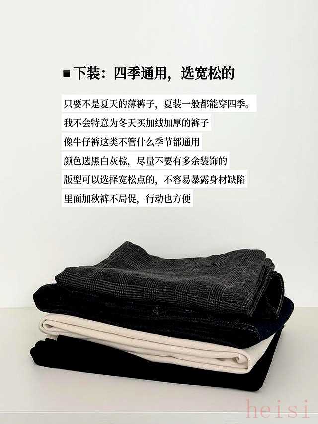 - "基础色":选择一些基础色的单品,如黑色、白色、灰色、米色等,这些颜色容易搭配,且不易过时。
