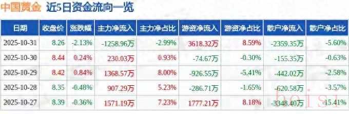 2025年10月31日,中国黄金(600916)股价小幅调整,收盘报8.26元,跌幅2.13%。全天成交50.93万手,成交额4.21亿元,换手率3.03%,交易活跃度保持平稳,牵动不少投资者目光。