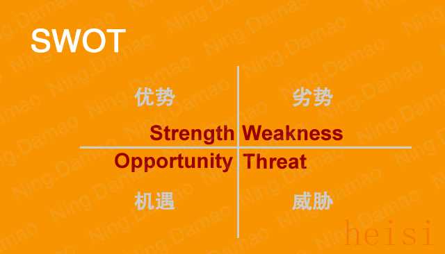 SWOT分析:由美国学者肯尼斯·安德鲁斯(Kenneth R. Andrews)于1971年正式提出。对于初创型公司来说,SWOT分析应该先于CIS。正如古语所云:知己知彼方能百战百胜,创业犹如作战,如果不先做SWOT分析,战场在哪里都不清楚,何谈战胜?