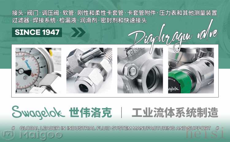 Swagelok创建于1947年,专注于为全球客户提供流体系统产品和服务的跨国企业,主要生产接头、阀门、调压阀、软管、流体系统组件等系列产品,并提供定制化的流体系统组件和解决方案,产品广泛运用于电力、油气、制药、半导体等行业,销售网络遍布全球数十个国家和地区。