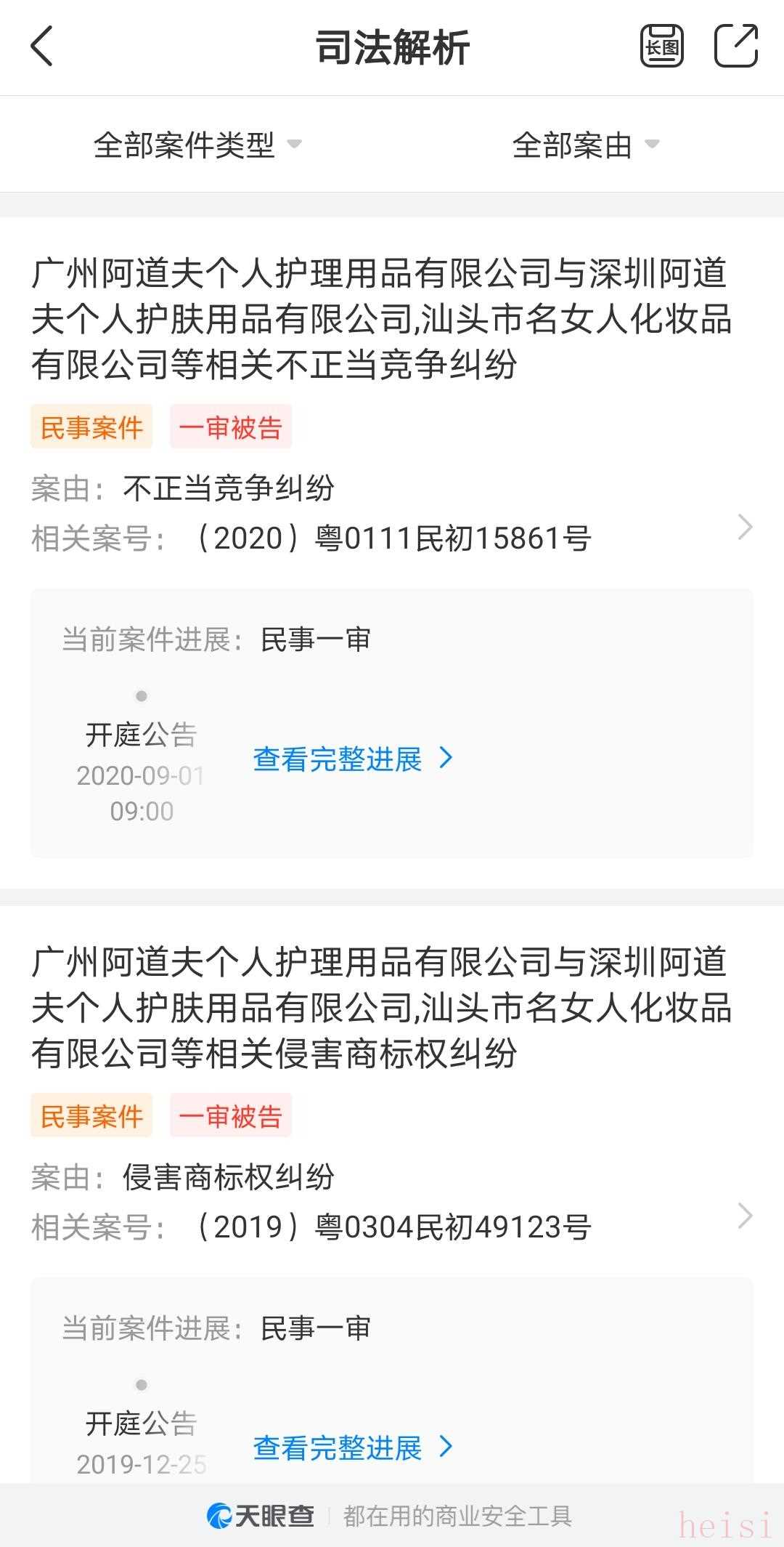天眼查显示,广州阿道夫个人护理用品有限公司以“侵害商标权”、“不正当竞争”为由,将深圳阿道夫个人护肤用品有限公司等诉至法院。