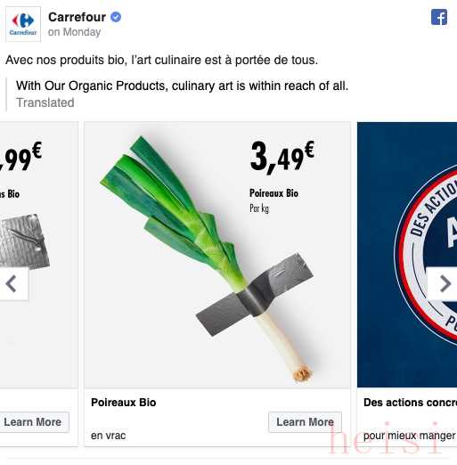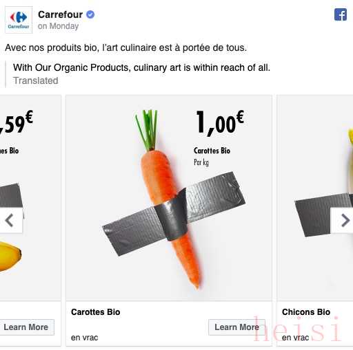 家乐福则把各种新鲜蔬菜用模仿艺术品的方式摆了造型,并附上它的价格,比如香蕉1.59欧元、胡萝卜1欧元、大葱3.49欧元。