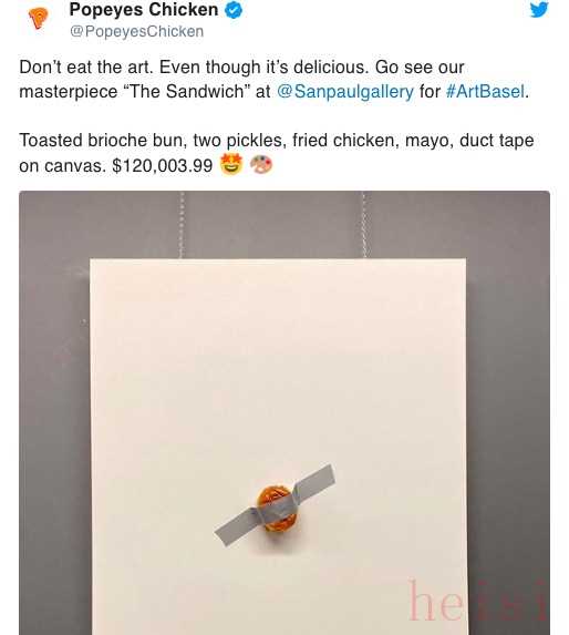 Popeyes炸鸡也把一颗汉堡用胶带贴在墙上(虽然胶带太宽了遮挡了大半并不容易认出来),并强调“不要吃艺术品,尽管它很美味,去看看我们的杰作‘汉堡’吧。烤小圆面包、两片泡菜、炸鸡、蛋黄酱,加上胶带,120003 .99美元”。