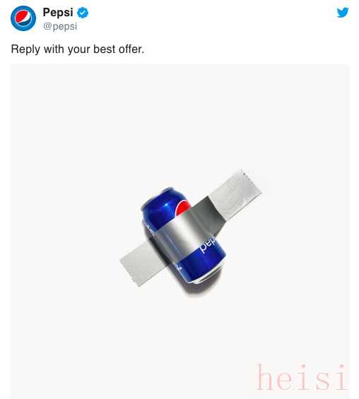百事可乐率先在Instagram上po出一张图片,是用同款银色胶带在白色墙壁上粘贴的一罐可乐,“请给出你的价格”——似乎在以同样方式向粉丝们拍卖一罐普通可乐。