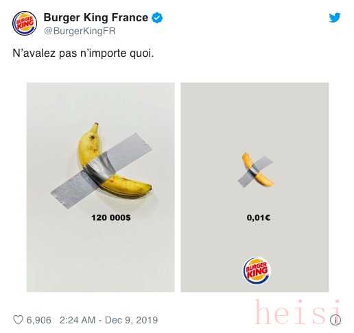 汉堡王把售价12万美元的香蕉和自己的产品来了个直观对比——一根同样的黄色的薯条,用胶带贴在墙上,只要0.01欧元,并表示“不要吃任何东西”。