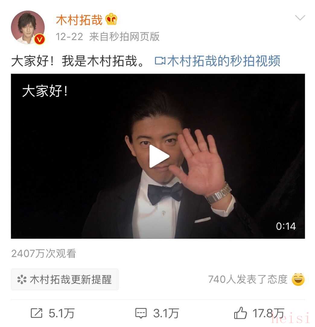这波福利简直来得猝不及防,木村拓哉招招手,请大家关注他,瞬间便吸引了十万粉,男神的号召力还是杠杠的!