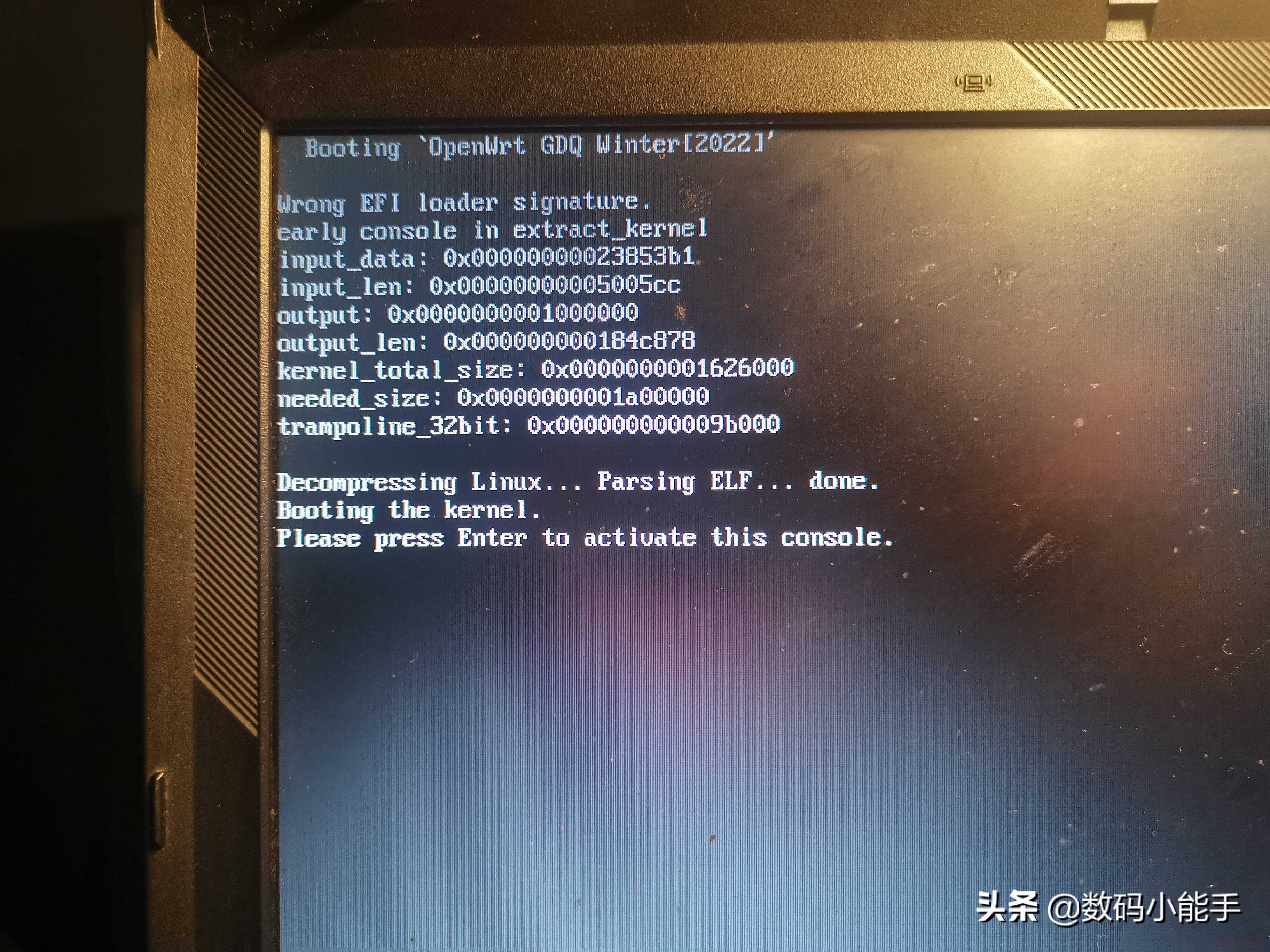 重启时候还是在按回车键提示的时候,按一下回车键,等到电脑再次出现这个界面,就说明OpenWrt软路由已经启动了。
