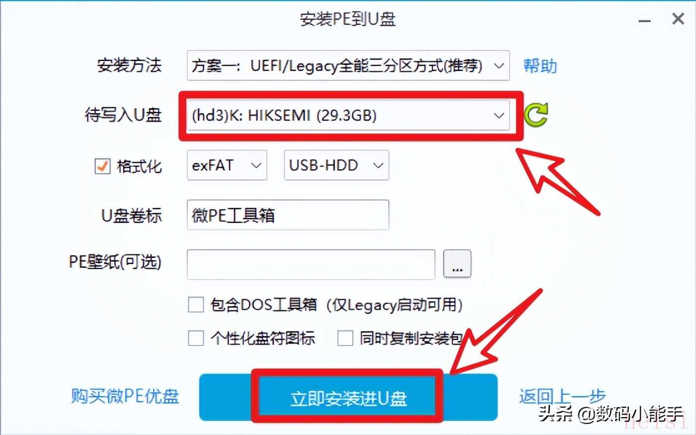 在这个界面确保“待写入U盘”那里是我们准备刷入OpenWrt系统的那个U盘,然后其它的都不要动,保持默认,直接点击下面的“立即安装进U盘”。需要说明的是:此步骤会格式化你的U盘,请确定你U盘里面的资料已经备份!!!