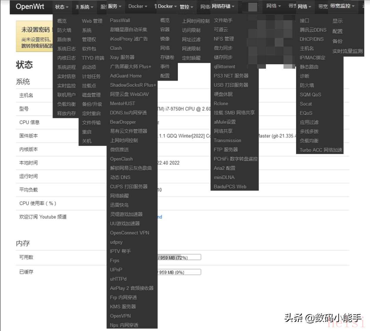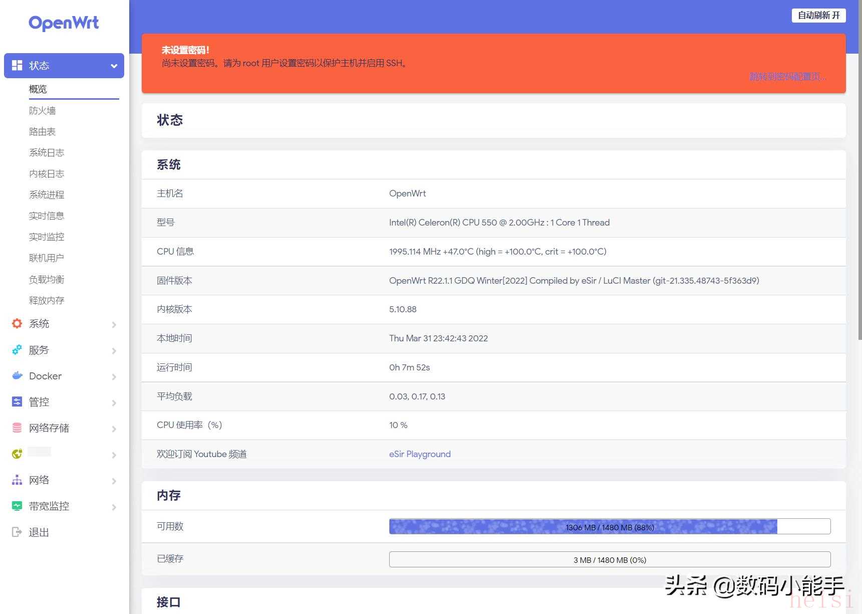 然后我们就可以看到OpenWrt软路由的主界面了。不过此时我们还必须对它进行一些必要的设置,才能让它里面的一些插件发挥作用。