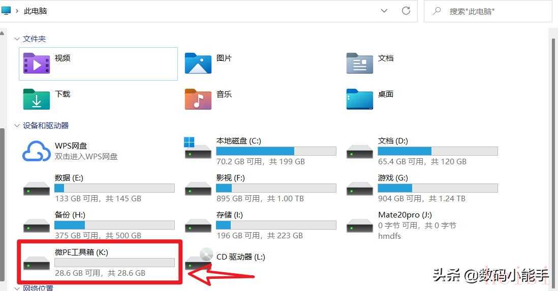 然后我们在点开桌面上的“此电脑”,在“设备和驱动器”里面就能看到我们的微PE盘符了(其实就是我们的U盘盘符),点击打开它。