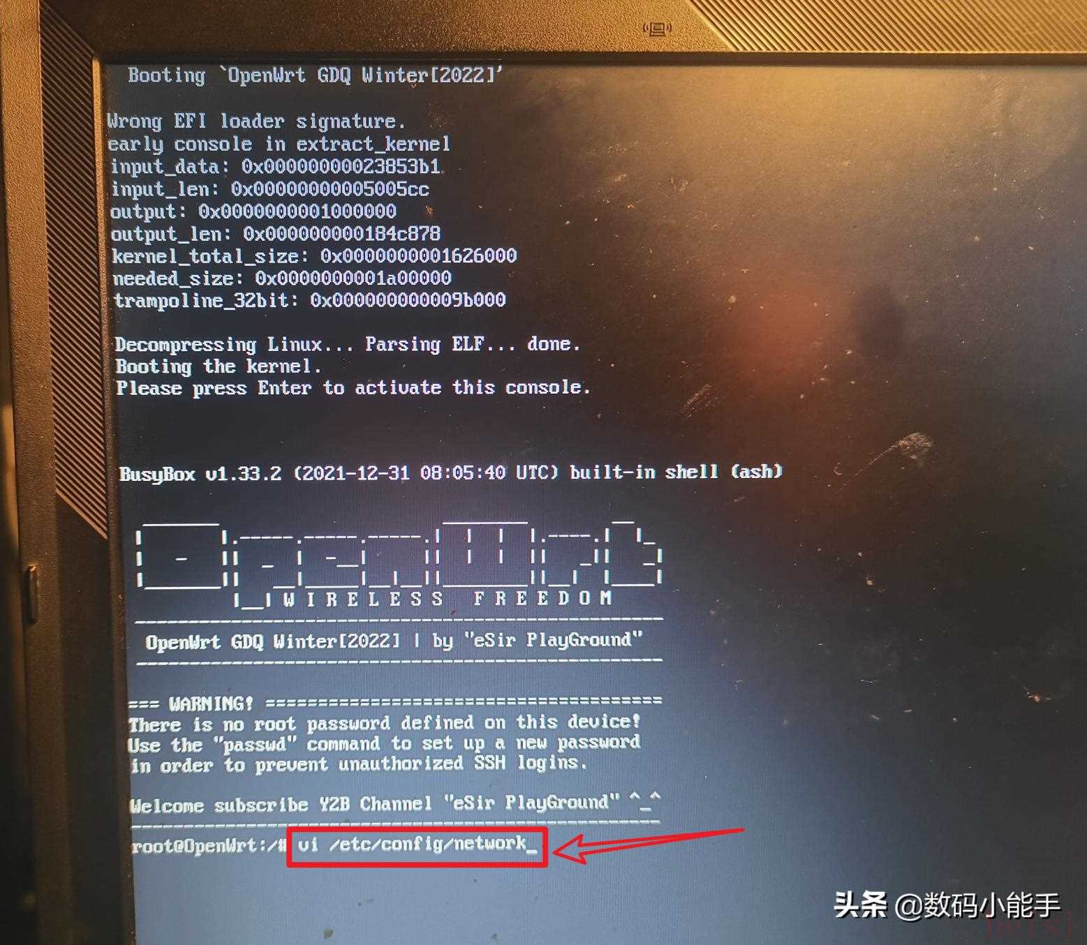 重启之后我们就可以直接拔掉U盘。这个时候就会发现电脑屏幕上已经开始运行我们写入的OpenWrt固件文件了