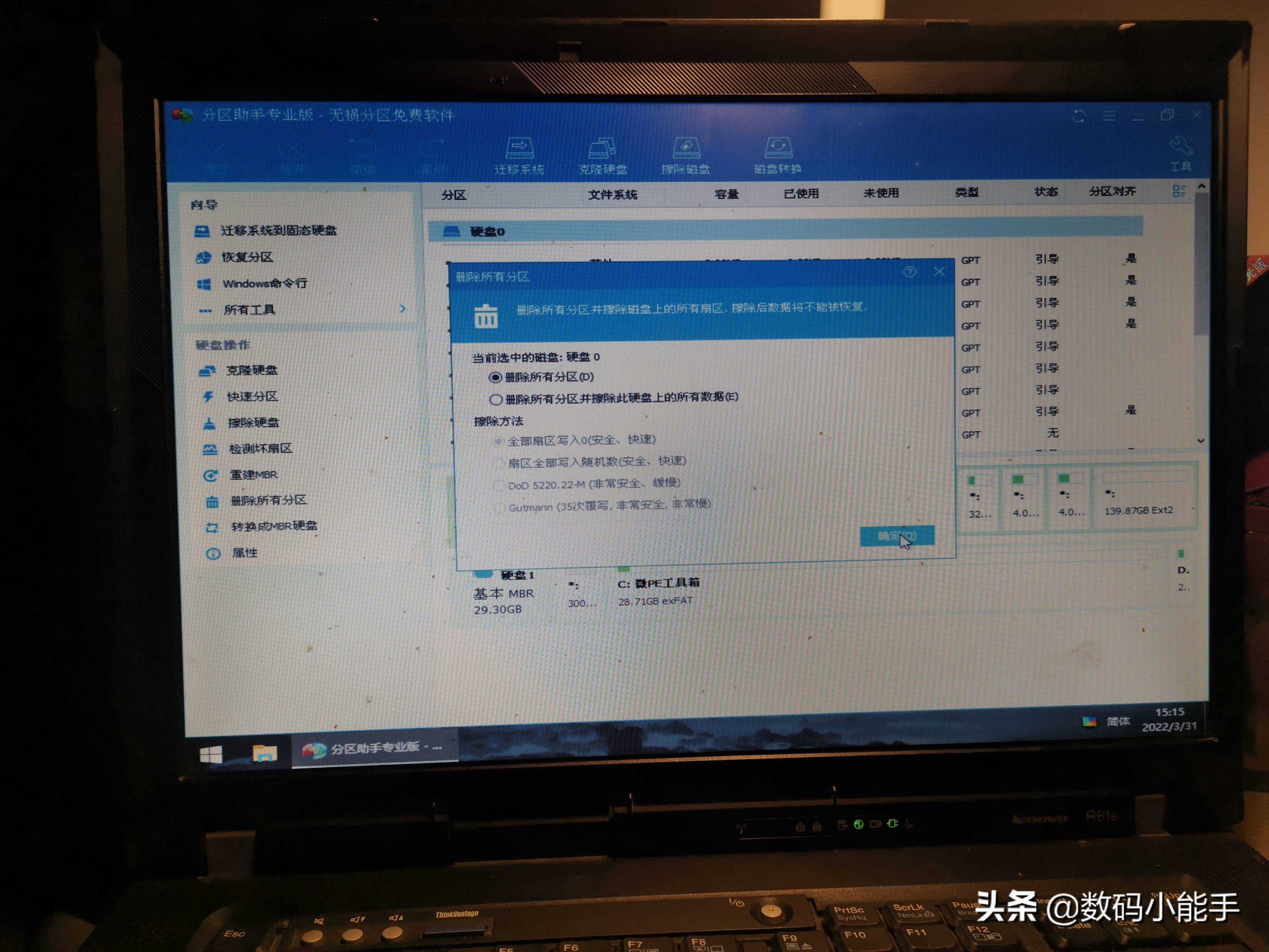 然后选择我们将要安装的电脑硬盘,鼠标右键选择“删除所有分区”,我这里因为电脑就一块硬盘一个分区,我直接选择了整块硬盘进行操作。