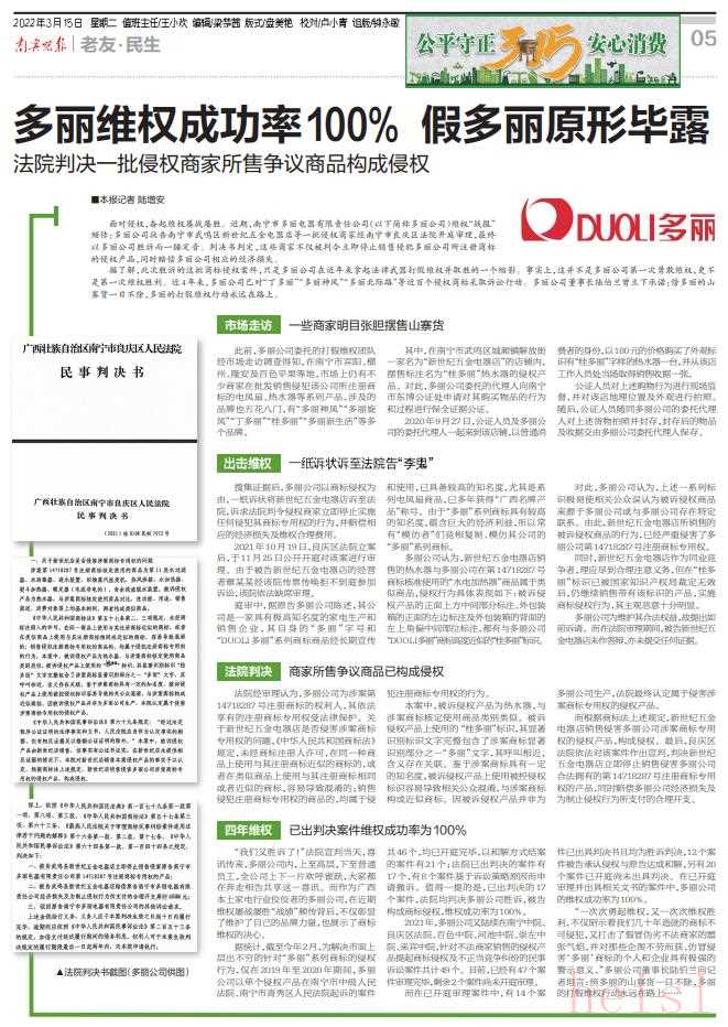 经过了69年的发展历程,南宁多丽电器成为广西家电生产制造企业中的佼佼者,并先后荣获“广西著名商标”“广西名牌产品”等荣誉称号。雷厉风行5年多维权打假成效斐然俗话说“树大招风”。随着南宁多丽电器做大做强,一些不法商家通过“傍名牌”生产的“山寨货”充斥市场,这让广大消费者掉进“品牌”选择陷阱。为打击各种商标侵权行为,从2018年起,南宁多丽公司拿起法律武器,委托区内外知名律师事务所和知识产权代理公司作为维权团队进行打假。
