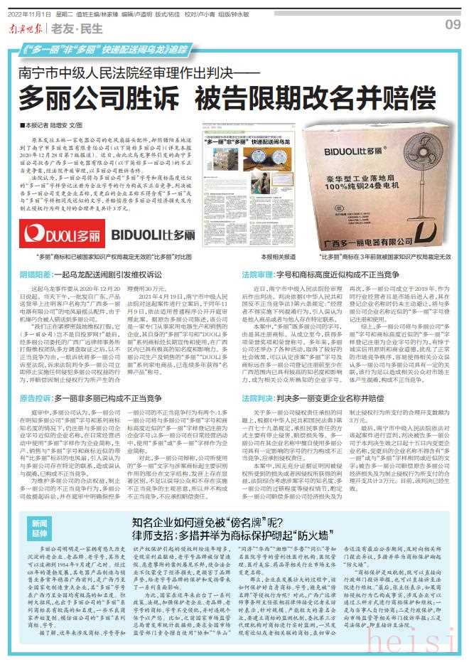截至目前,南宁多丽公司已对“丁多丽”“多丽神风”“多丽北际路”等208个商标采取行动,其中这些商标绝大部分已被国家知识产权局宣告无效或不予注册。在商标侵权及不正当竞争诉讼方面,以单个侵权产品在广西各地法院起诉的案件共87个,法院已作出判决的案件中,均判决南宁多丽公司胜诉,被告构成商标侵权,维权成效斐然。除此之外,针对部分攀附多丽企业字号知名度的公司,多丽已提起不正当竞争侵权诉讼,目前已有法院判决一家玉林的公司变更企业名称,并要求变更后的企业名称不得含有与多丽相同或近似字样。出于维权打假的成效及影响力,今年4月25日,在自治区高级人民法院召开广西法院知识产权司法保护新闻发布会上,南宁市多丽电器有限责任公司、南宁市联广家电经营部与中山市多丽电器制造有限公司侵害商标权及不正当竞争纠纷案入选2022年度广西法院知识产权司法保护状况白皮书及十大知识产权审判案件。不断尝试营销创新实现逆势上扬随着互联网经济崛起,线上销售的营销方式越来越普及,南宁多丽电器紧跟形势不断尝试营销创新,通过线上线下相结合的方式寻找新的市场机遇,充分利用新媒体营销,开设了多丽官方抖音账号,通过直播销售、短视频营销等方式,开拓年轻市场。得益于国家政策和自身的努力创新改革,在广西深耕69年,已经成为本土家电行业佼佼者的南宁多丽电器,2022年销量逆势增长达5000多万元,增幅百分之八。