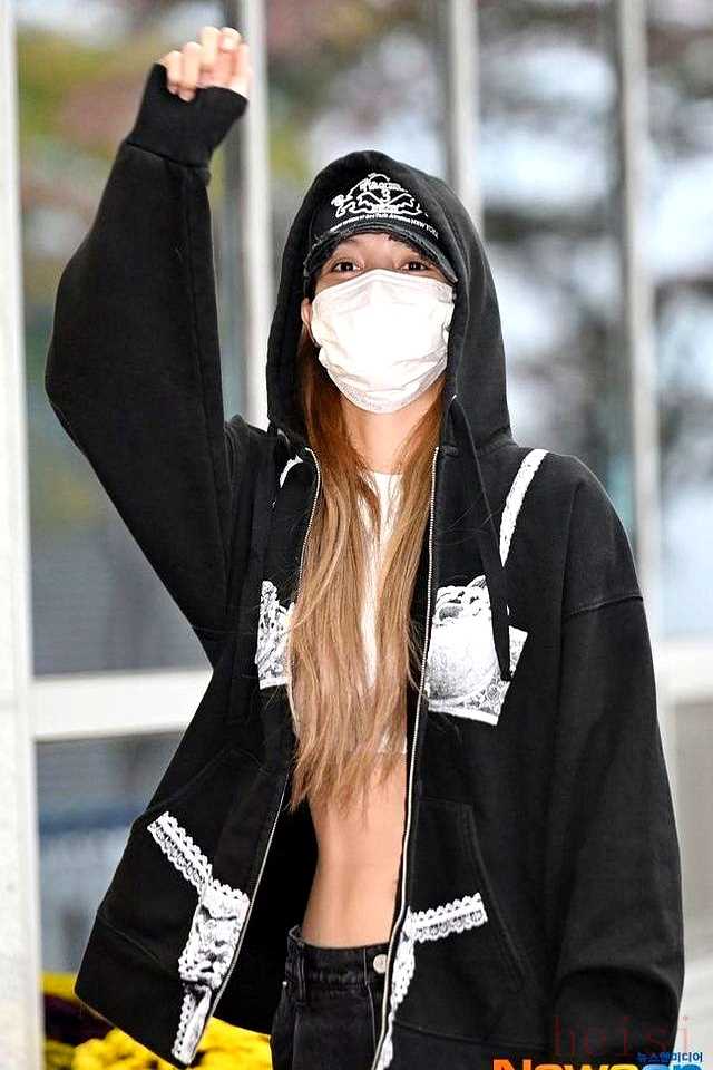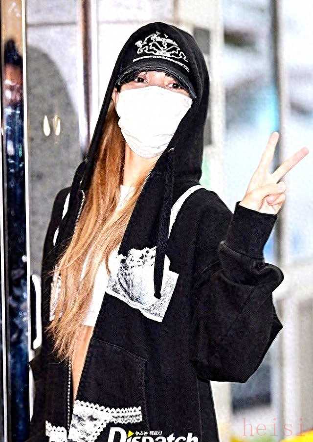 10月31号清早,仁川机场,她戴着黑口罩,帽子压很低,走路带风。