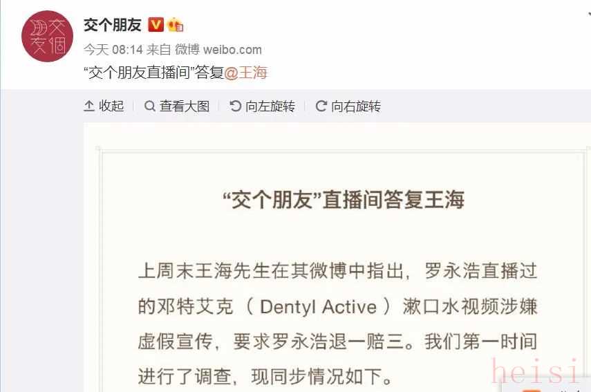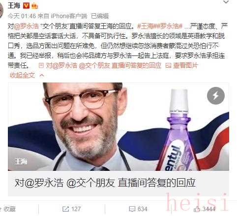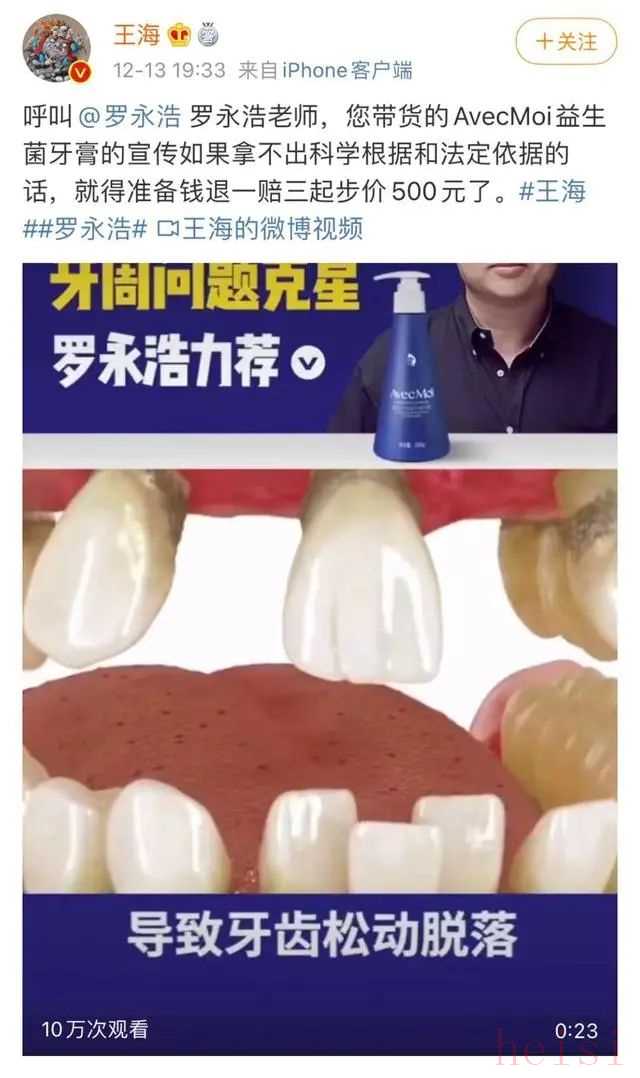 在微博中,王海还喊话罗永浩,称“漱口水的效果用洗牙视频来表现,涉嫌虚假宣传得准备钱,退一赔三起步价500元了”。