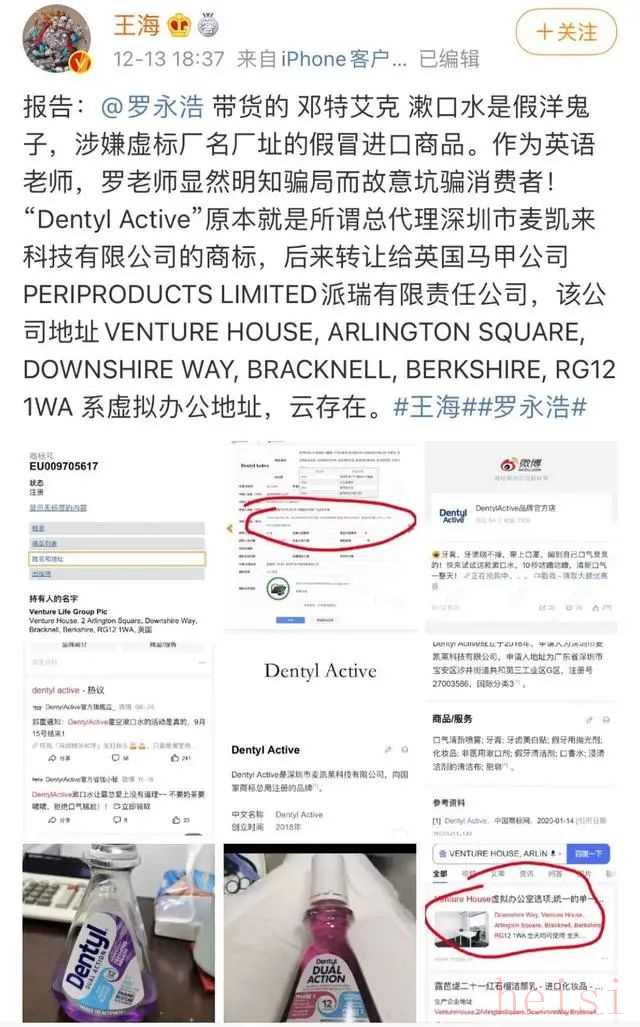 12月13日,职业打假人王海在微博中连续发文对罗永浩推进的一款“邓特艾克(Dentyl Active)”品牌漱口水提出质疑。