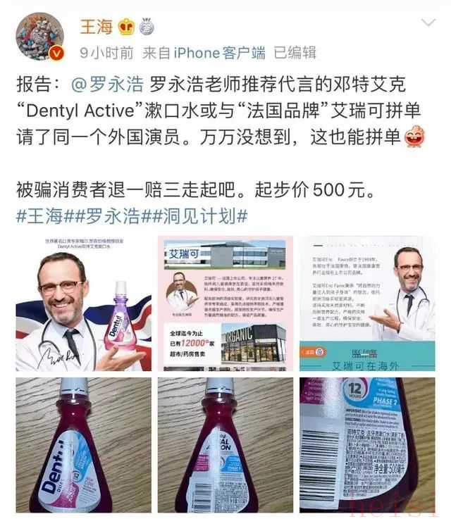 其次,王海指出,邓特艾克漱口水或与“法国品牌”艾瑞可拼单请了同一个外国演员。