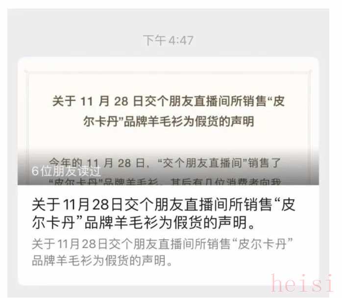 11月28日,交个朋友直播间销售了“皮尔卡丹”品牌羊毛衫。但随后,有几位消费者反馈,他们在收货后怀疑收到的衣服不是纯羊毛,是假货。