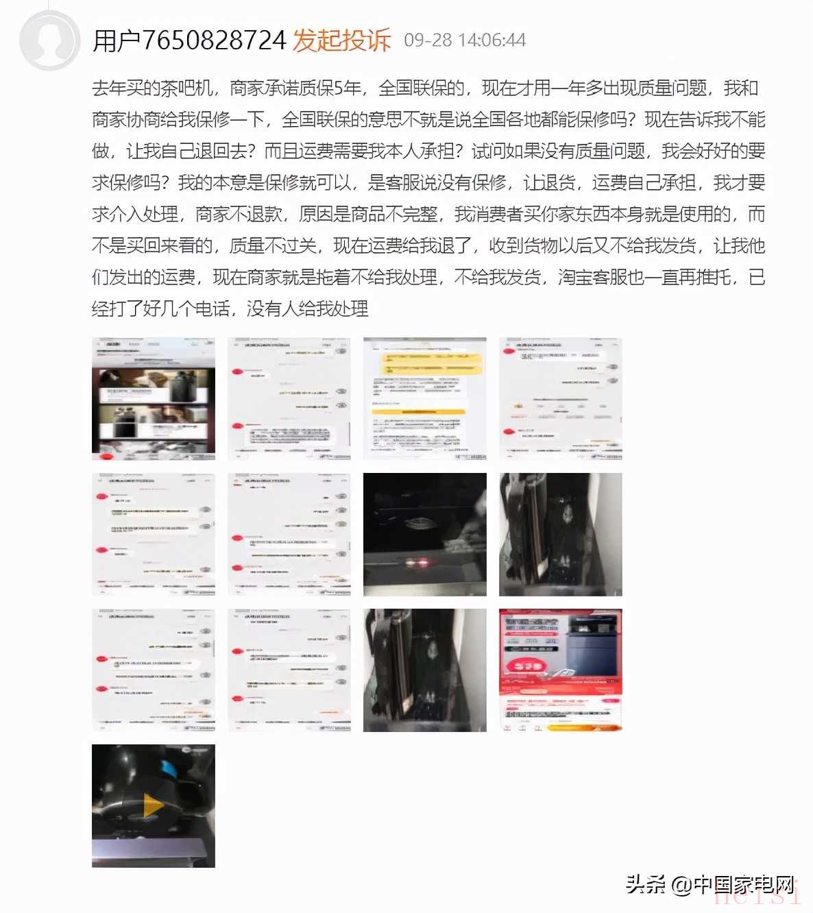 不过,茶饮相关家电热销的同时,产品质量问题也浮出水面。在黑猫投诉平台上,有消费者反映某大品牌茶吧机发生爆炸自燃,且联系售后时,相关方态度恶劣,拒绝赔偿。此外,还有不少消费者反映自家的茶吧机在使用一年甚至数月后,即发生故障,包括管路无法进水、产品异味、龙头出水不畅、产品漏水、无法加热、触屏损坏等,还有某些带智能语音控制的产品“胡言乱语”……此外,由于许多消费者会通过电商等渠道购买此类产品多,在售后服务方面,也出现了平台方与品牌方踢皮球,消费者承担高昂维修运费等纠纷。